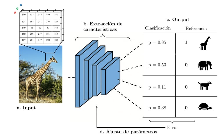 Al comienzo, la red ofrece predicciones erróneas, pues los parámetros de las matrices son completamente aleatorios. No obstante, al ser entrenada con miles de ejemplos, compara su estimación con la respuesta correcta, calcula el error y reajusta sus valores internos. Esto se corresponde con un proceso de optimización —típicamente algoritmos de gradiente descendente [2]— ampliamente estudiados en el ámbito matemático. De este modo, va aprendiendo a dar mayor ponderación a las características relevantes — en el caso de una jirafa, por ejemplo, sería su cuello prolongado o las manchas en la piel— y a desestimar aquellas menos significativas. Con varias iteraciones, la red neuronal logra identificar patrones que caracterizan a cada una de las categorías y de esta manera aprender a estimar correctamente cada una de ellas. Este procedimiento guarda un paralelismo con el aprendizaje humano: desde la infancia, la repetida observación de animales, acompañada del nombre que las designa, va conformando en nuestro cerebro un esquema de rasgos esenciales que nos permite distinguirlos.